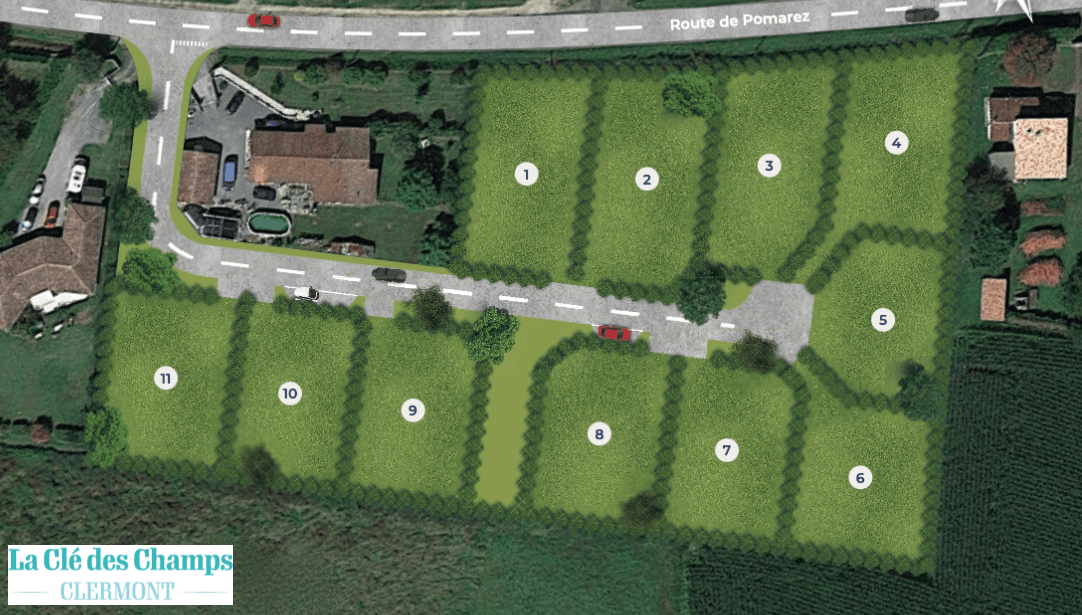 Nos terrains à bâtir à Clermont, situés Route de Pomarez (D15), offrent une belle opportunité pour concrétiser votre projet de construction dans un environnement calme et agréable. Ce lotissement se compose de 11 parcelles, d’une superficie comprise entre 631 m² et 798 m², idéales pour imaginer une maison à votre image.