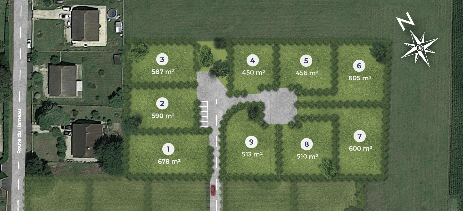 Le programme se compose de 9 terrains à bâtir à Denguin, avec des superficies comprises entre 450 m² et 678 m², idéales pour des projets de construction personnalisés.